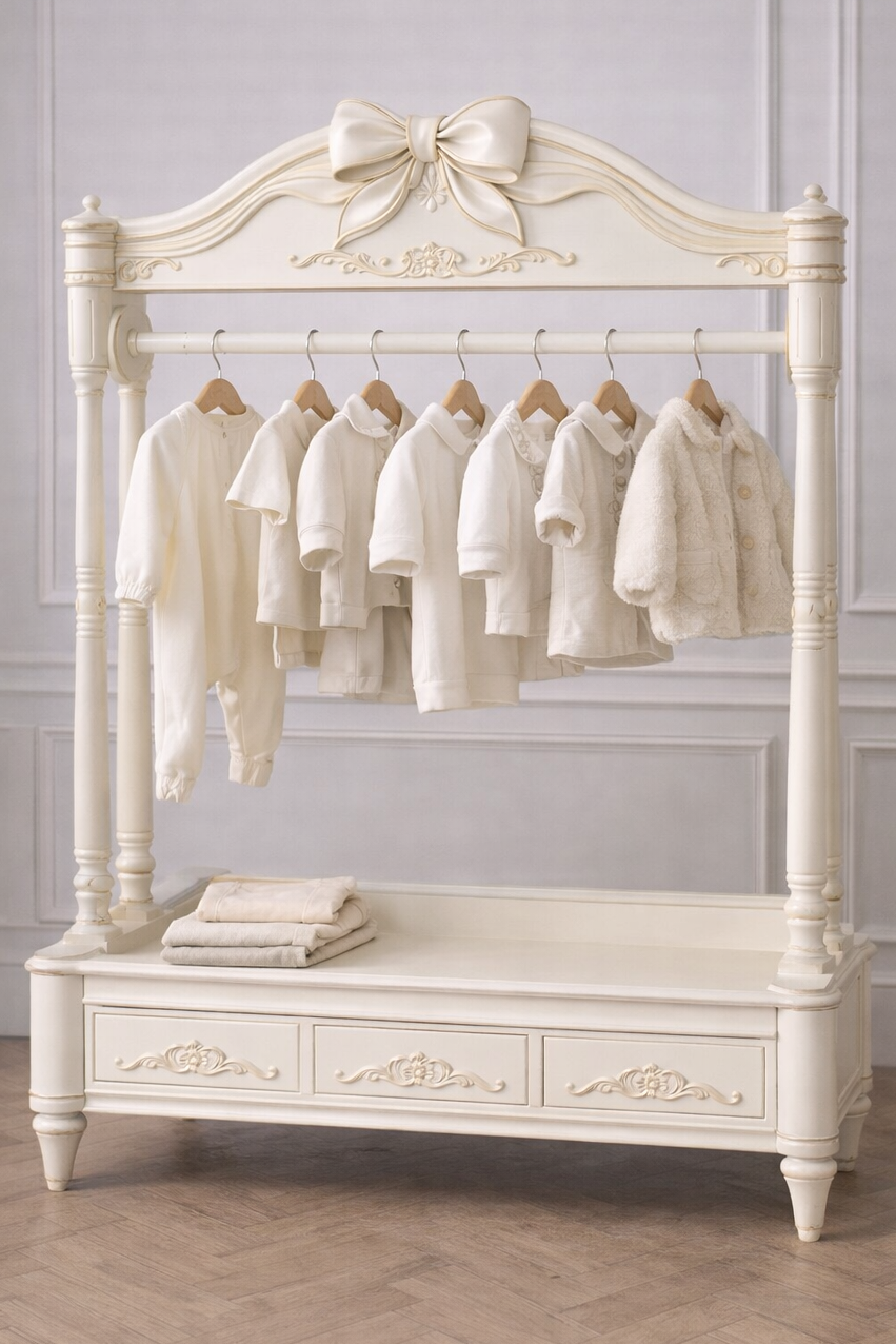 The open rail allows clothing to be displayed neatly and within easy reach, while the integrated base with drawers below offers practical storage for folded garments and everyday essentials. Subtle carved detailing and balanced proportions ensure the piece feels light, elegant, and enduring.