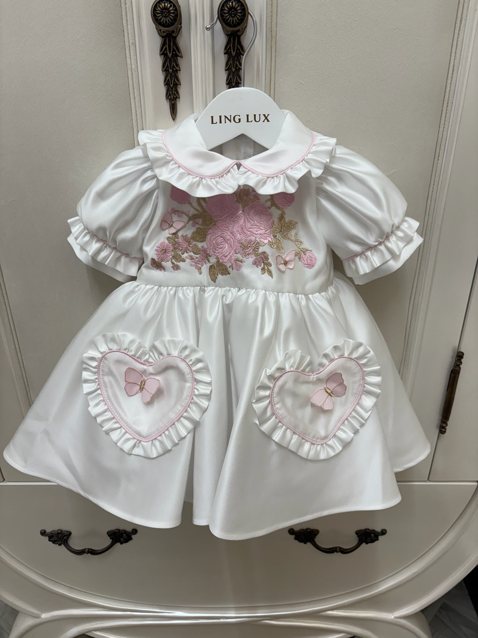Indulge in elegance with our handcrafted silk dress set, designed for timeless charm and comfort. This exquisite set includes a beautifully tailored silk dress and a matching bonnet, both made from the finest silk for a soft, delicate feel. Featuring intricate cherub prints on the pockets, this piece exudes sophistication and grace—perfect for special occasions or cherished moments.