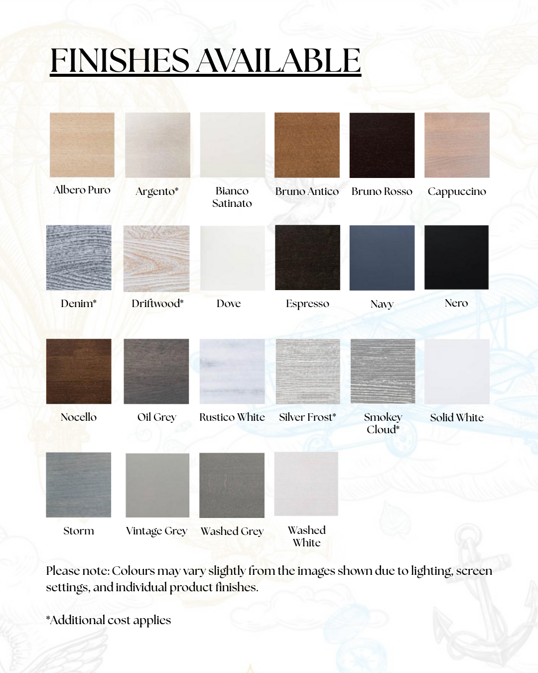 Wood is a natural material prone to variations and imperfections which cannot be foreseen or prevented. Beech species is a high-density straight wood which may vary in color from light blonde to orange or light red. The grain pattern presents unique features like “bird eye”, “fiddle back” curly lines or light speckles. It is the nature and beauty of solid wood to vary in appearance and characteristics for no two trees are alike. Wood swatches, colour samples, pictures and other marketing materials are an accurate, reasonable but not exact representation of the actual furniture and finish you will receive.