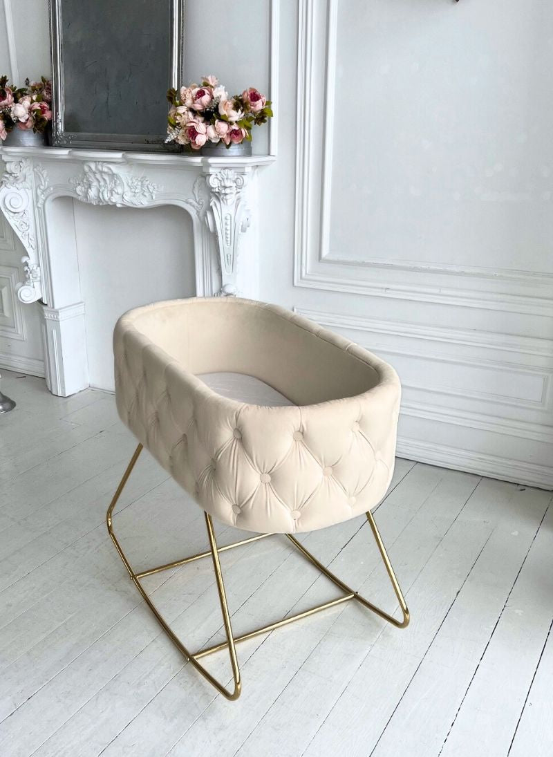 Crafted with exquisite attention to detail, the Lillie Bassinet features button-tufted upholstery and is available in a soft milk, beige, grey, or pink base colour to suit any nursery aesthetic. Choose between gold or silver legs for a refined, personalised finish that reflects your style.