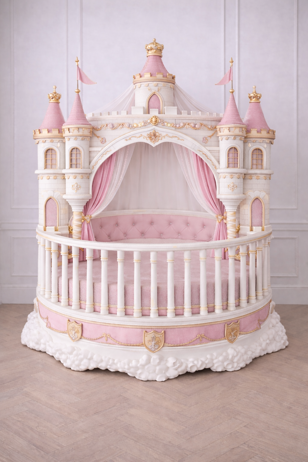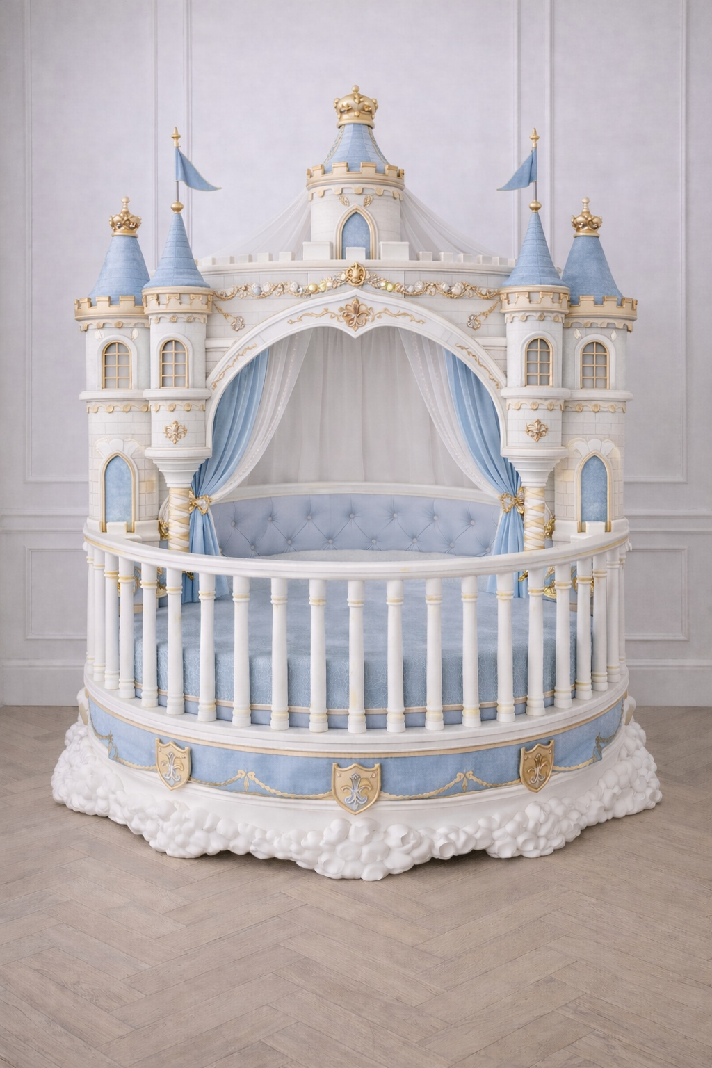 A majestic centrepiece designed for the most enchanting nurseries, the Maison Royal Round Castle Cot is a celebration of fairytale luxury and bespoke craftsmanship. Inspired by romantic castle architecture, this beautifully sculpted round cot features elegant detailing, soft curves, and a timeless silhouette fit for a little royal.