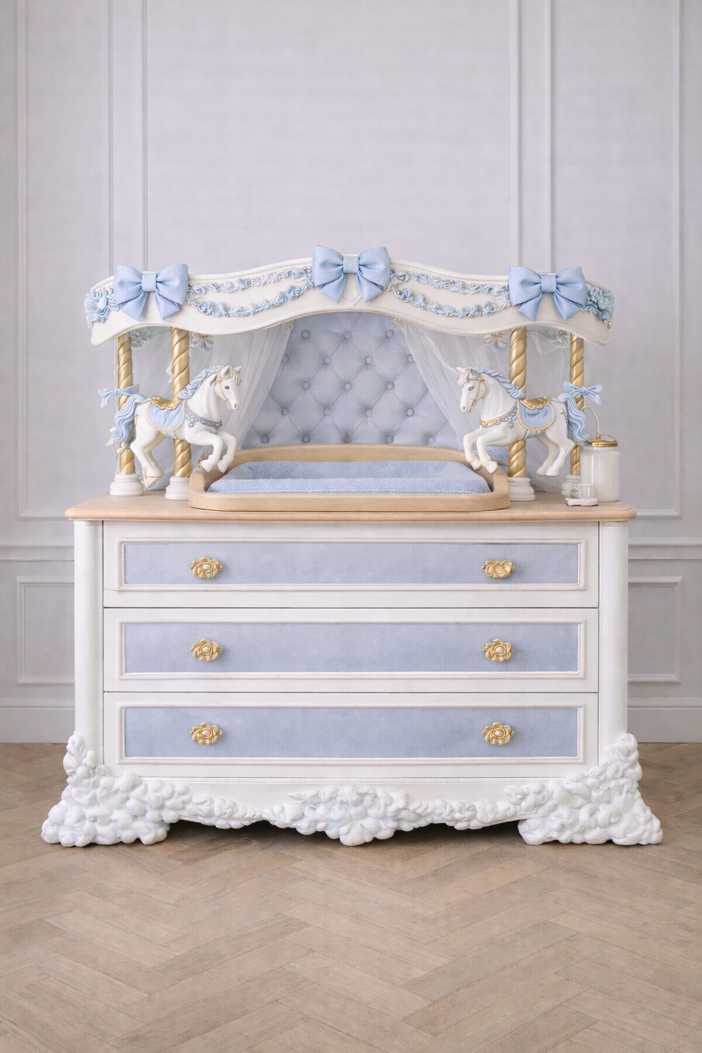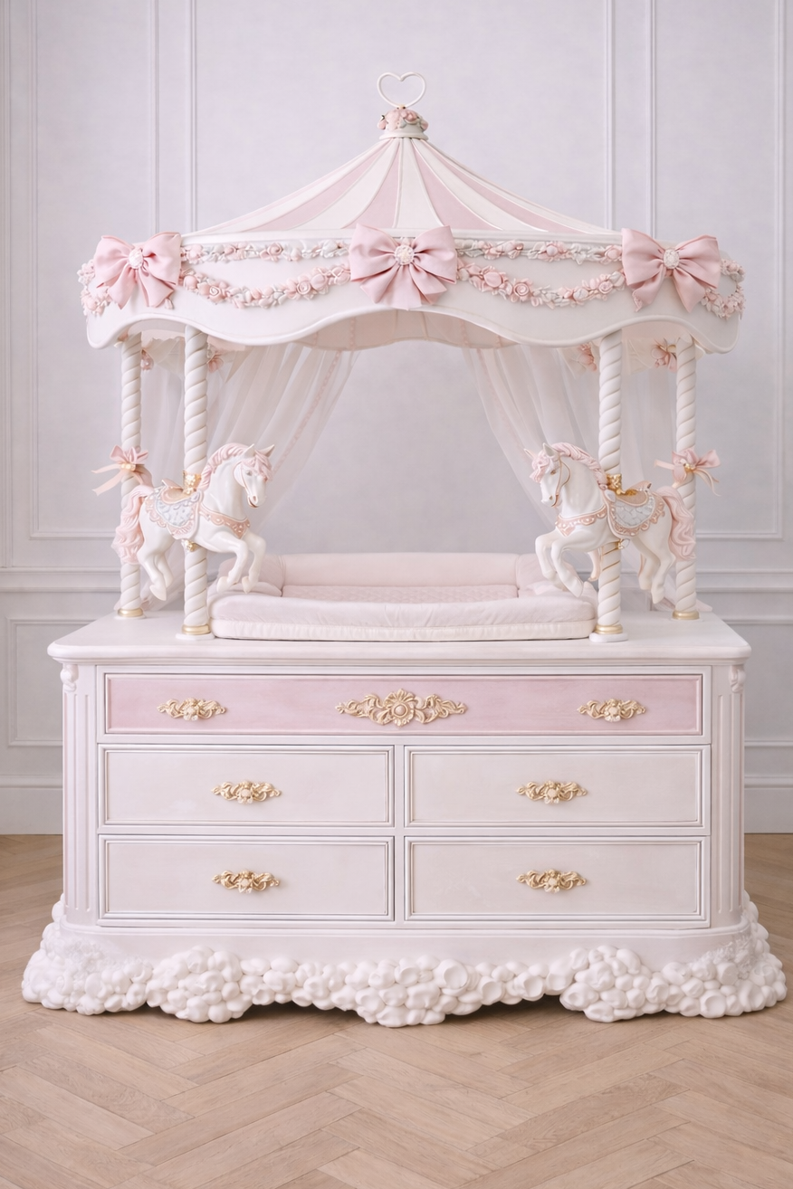 An enchanting blend of elegance and practicality, the Royal Carousel Change Table brings fairytale charm to your nursery while offering everyday functionality. Inspired by classic carousel motifs, this exquisite piece features delicately sculpted horses, soft blush accents, and a graceful canopy adorned with bows and floral detailing.