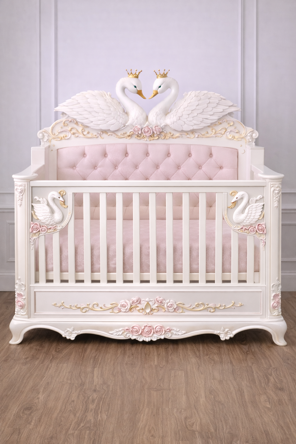 Graceful, romantic, and exquisitely crafted, the Swan Lake Cot is a timeless centrepiece inspired by the elegance and symbolism of the swan. Featuring beautifully sculpted crowned swans with softly outstretched wings, this enchanting cot brings a sense of serenity, love, and fairytale charm to your nursery.