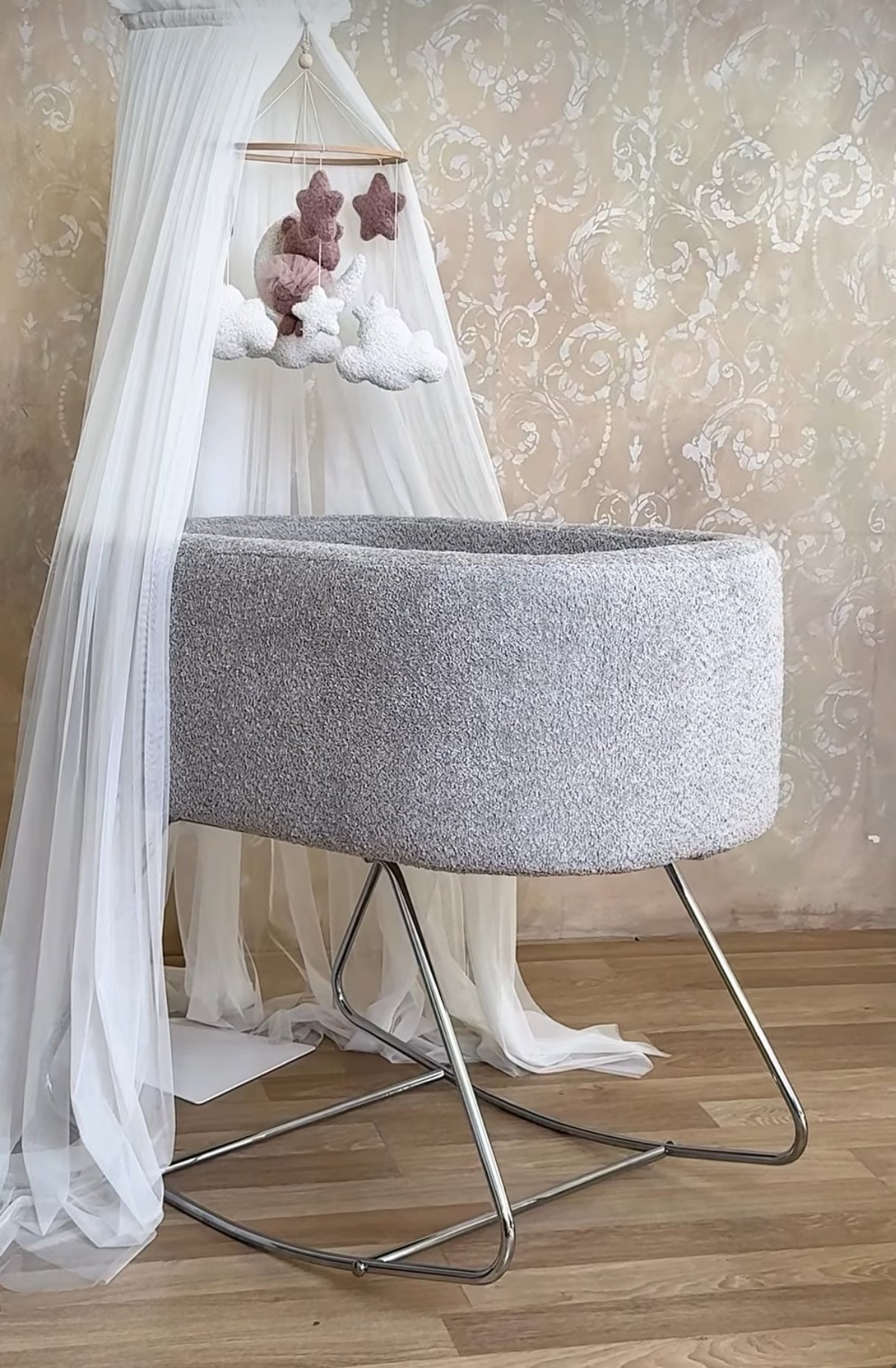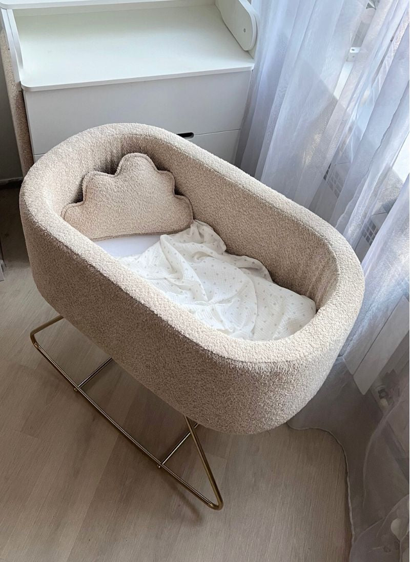 This designer bassinet is available in soft, neutral tones — Beige, Grey, or Milk — and features your choice of gold or silver legs for a polished, custom look. Its clean, structured silhouette adds a contemporary touch to any nursery, making it as much a statement piece as a functional cradle.